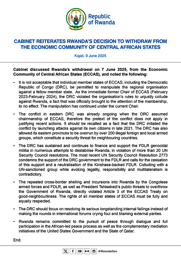 Cabinet discussed Rwanda's withdrawal on 7 June 2025, from the Economic Community of Central African States (ECCAS), and noted the following: