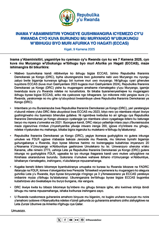Inama y'Abaminisitiri, yaganiriye ku cyemezo cy'u Rwanda cyo ku wa 7 Kamena 2025, cyo kuva mu Muryango w'Ubukungu w'lbihugu byo muri Afurika yo Hagati (ECCAS), maze ishimangira ibi bikurikira: