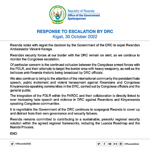 Rwanda notes with regret the decision by the Government of the DRC to expel Rwandan Ambassador Vincent Karega.