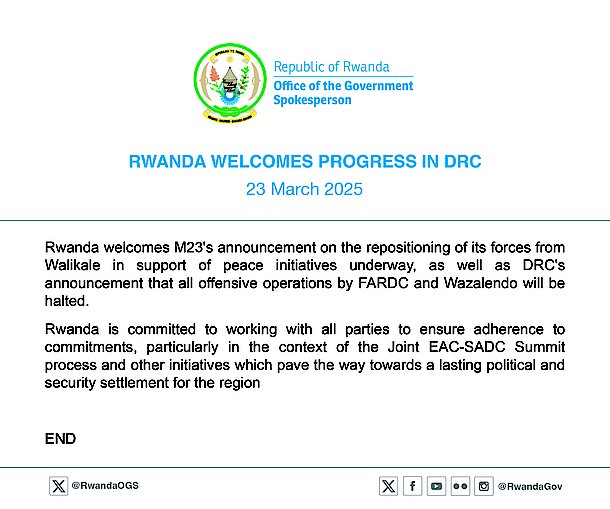 Rwanda welcomes M23's announcement on the repositioning of its forces from Walikale in support of peace initiatives underway, as well as DRC's announcement that all offensive operations by FARDC and Wazalendo will be halted.