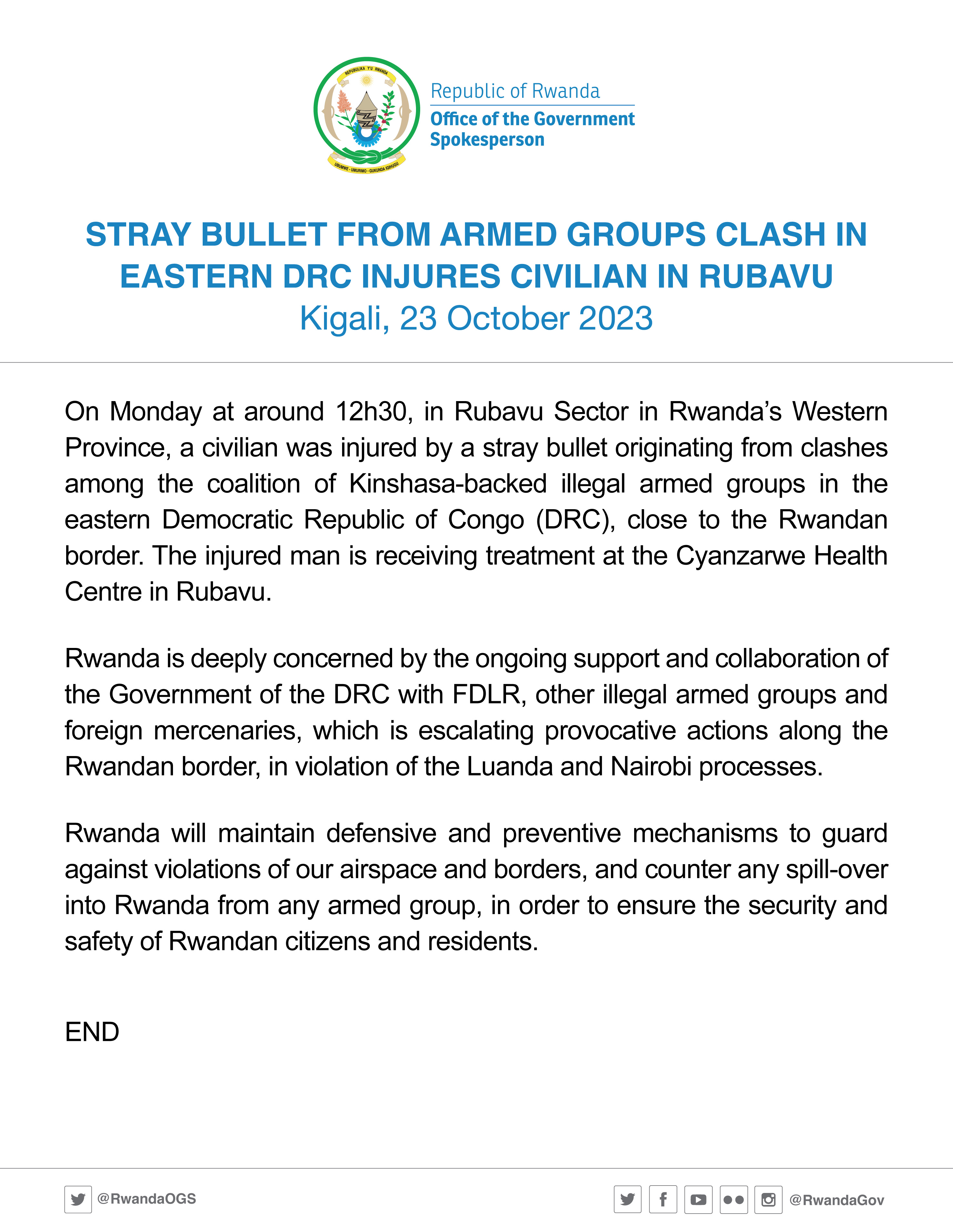 Le Rwanda continuera à déployer des systèmes de protection contre la violation de son espace aérien et de ses frontières, et fera obstacle à tout débordement du conflit dans l'Est de la RDC sur son territoire de la part d'un groupe armé afin de garantir la sécurité et la sûreté des citoyens et des résidents rwandais.